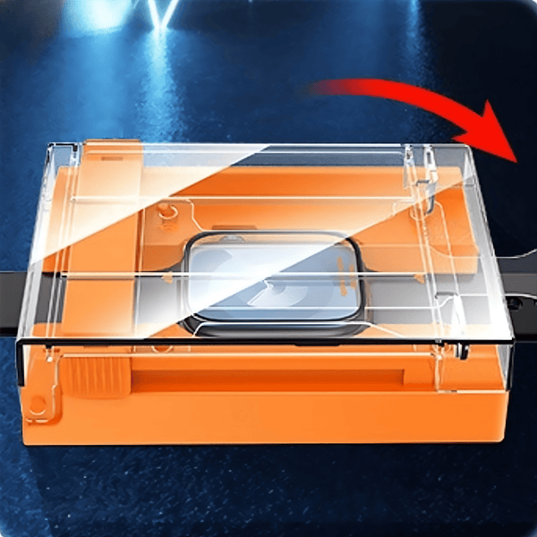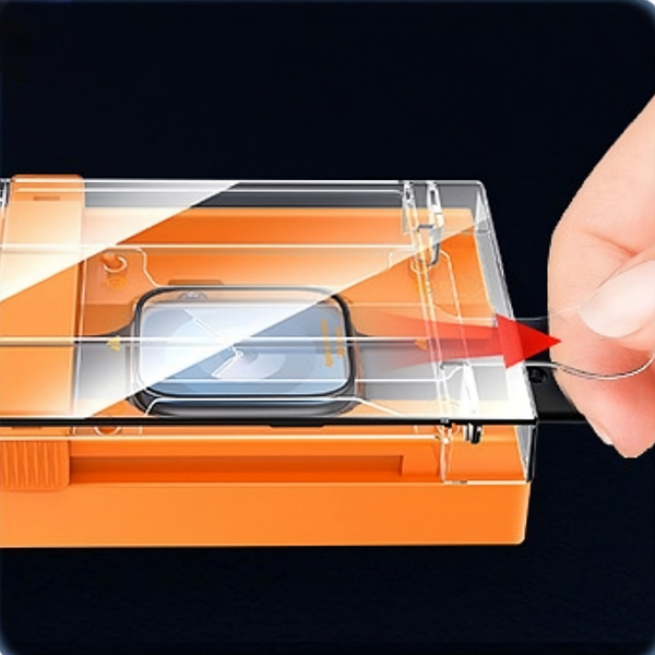 Tryck och skjut locket framåt enligt pilen – skärmskyddet appliceras automatiskt på plats utan bubblor.