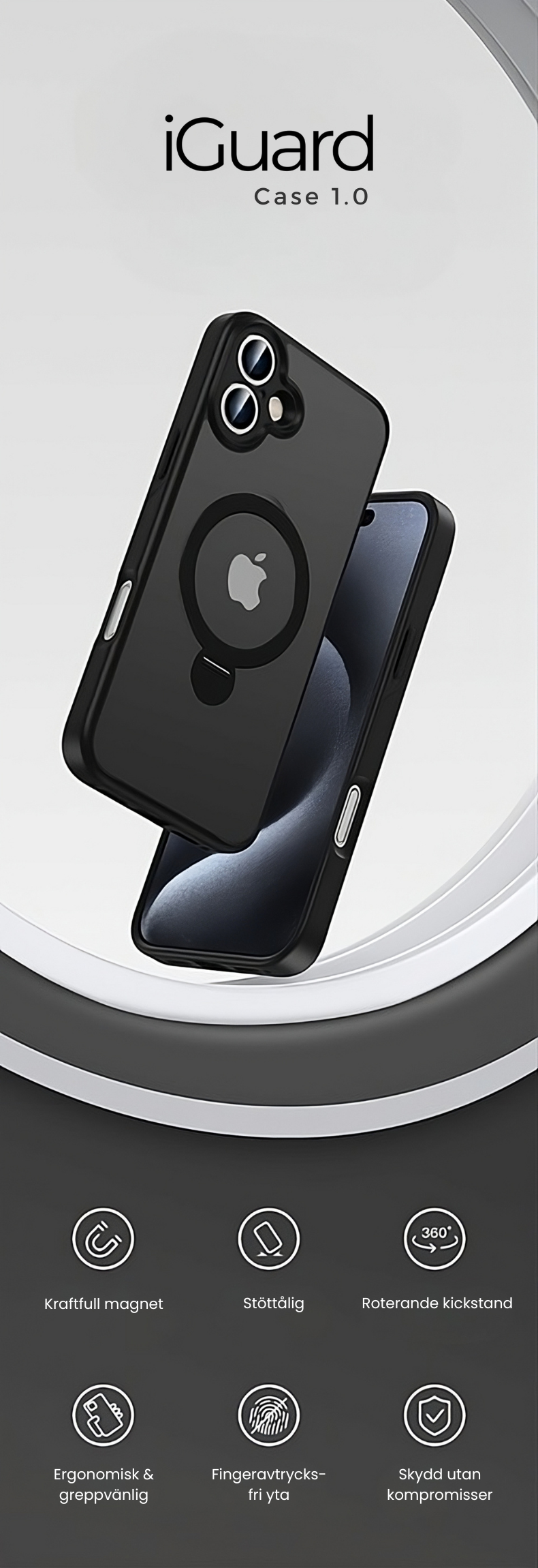 Med iGuard™ Case 1.0 får du ett genomtänkt premiumskal med tålig konstruktion, inbyggt ringstativ och full MagSafe-kompatibilitet – för just nu 249 kr. Det är ett skal som håller över tid. Och om något ändå skulle hända? Då är du täckt ut av vår nöjdhetsgaranti.