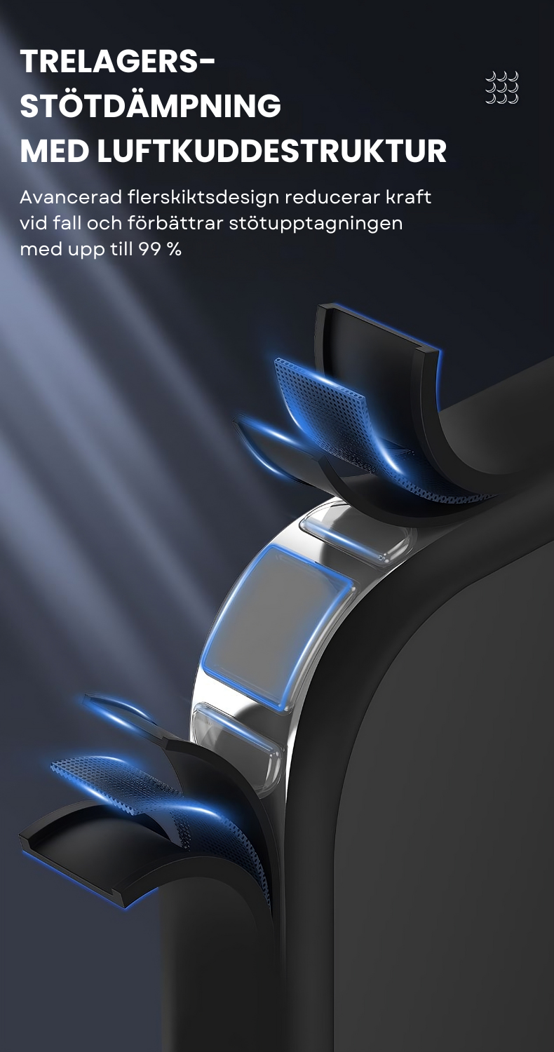 Skalet är uppbyggt i flera lager med luftkuddar i hörnen, en kärna av stöttålig TPU och ett yttre lager av slitstark PC. Tillsammans ger de 360° skydd mot fall, stötar och repor – utan att kännas klumpigt.