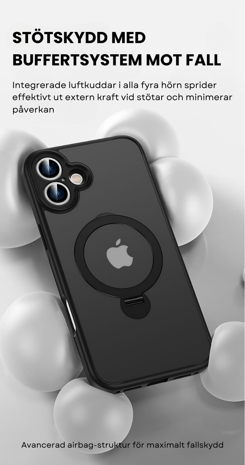 iGuard™ Case 1.0 är en genomtänkt helhetslösning som kombinerar skydd, funktion och design på riktigt. Med ett inbyggt 360° roterbart ringstativ kan du enkelt justera mobilen för videosamtal, läsning eller arbete – både stående och liggande.